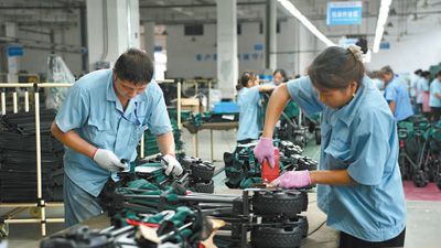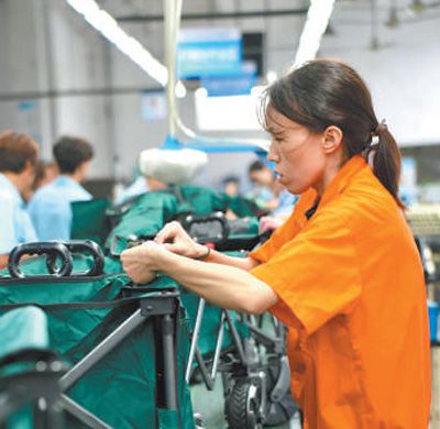 河南泰普森公司生产车间的工作人员正在组装户外小拉车。这批订单将于10月发往美洲市场。